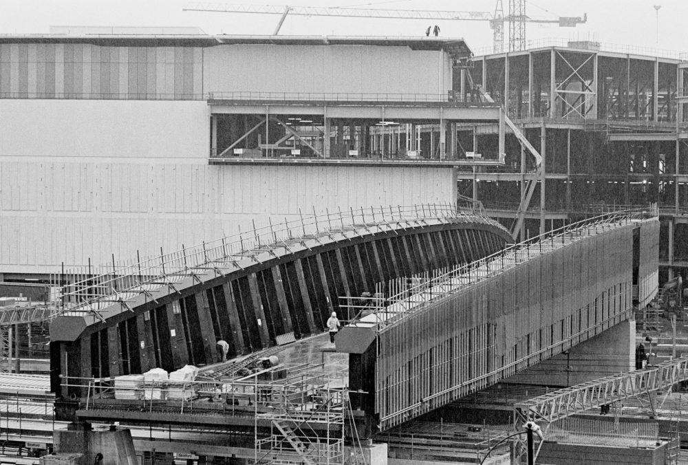 Roof of Aquatics Centre under construction. Taken 2009 from the multi-storey car park opposite Stratford bus station. Taken with an APS camera – remember those?